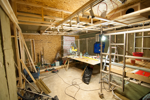 After the floor and ceiling were removed, a cable channel dug, and wood added to the internal walls to stiffen the structure: