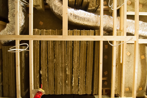 A close-up of the hanging absorbers at the back of the room. These are plywood panels faced with rockwool that are suspended from the top of the wooden frame. They absorb low-frequency energy by converting pressure variations on the front surface into movement of the panels.
