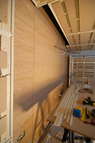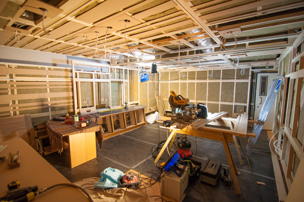 The internal timber framing that will hold the acoustic absorbers and will eventually be faced with fabric. Some absorber panels already in place: