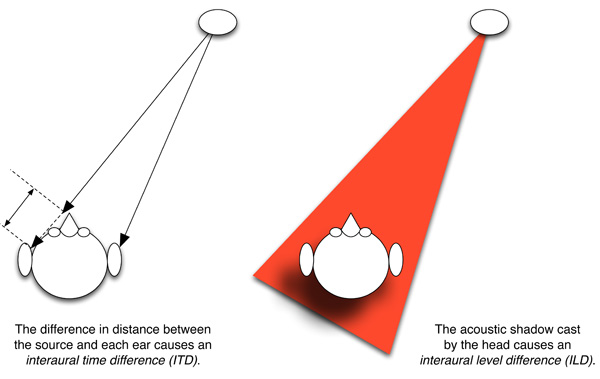 How we hearIf you close your eyes, you can still determine where noisy things are, as well as something about the room you're in. You're able to do this because you have two ears, one on each side of your head. A sound coming from one side of your head will reach the closer ear before the further one, and having your head in the way of the further ear will cause an acoustic 'shadow'. The shape of your ears also helps to differentiate where sounds come from due to the way the sound reflects within them. Your brain makes use of the way the room and your head and ears affect the sound to create this mental image of your surroundings.