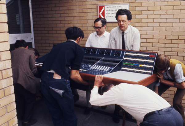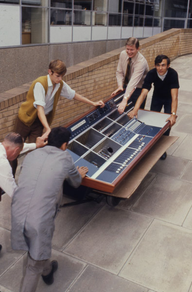 The first set of photos is from the installation of our first Neve studio console - an 8014. Looking at the photos, I'm guessing that this was in the early 1970s. It was installed originally in the studio in the Hall Undercroft, which entailed carrying it up many stairs. The studio originally featured a 4-track reel-to-reel recorder, which was later replaced by an 8-track.