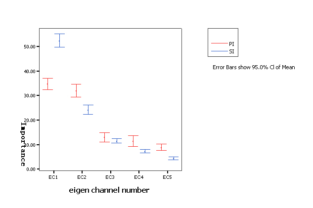Figure 1: Comparison between Perceptual Importance (PI) and Statistical Importance (SI) of eigenchannels