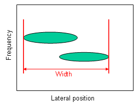 It is necessary to include an estimation of the perceived location of sounds within a model of the perceived auditory source width to take into account the fact that different simultaneous frequency components may have differing lateral positions. This can be demonstrated in the example shown below. If the location of each of the frequency components is not taken into account, then the overall width of the sound would be equal to the wider of the two components. As the two components are at different lateral positions, the overall width should logically be from the left hand edge of the left component to the right hand edge of the right component. A prediction of the perceived lateral position of each of the components is therefore required to take this into account.