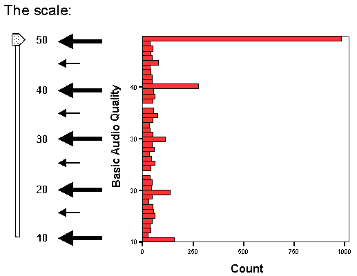 Although listeners were instructed that this scale is continuous (they were free to use any value from the scale), during the listening test they tended to give grades equal to labels more frequently than other grades from the scale. The bias effect is presented on a histogram of the obtained scores averaged for all subject and all experimental factors and plotted against the grading scale (see figure below). Apart from the main bias effect it is also possible to note an additional slight bias effect for grades like 15, 25, 35 and 45 (values exactly between the labels).